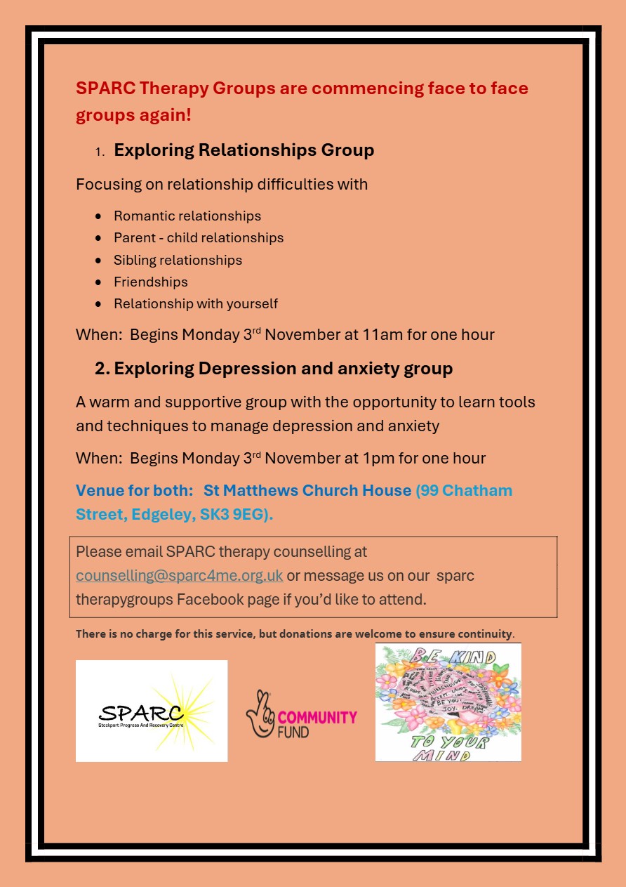 The counselling service at SPARC (Stockport Progress And Recovery Centre) are happy to announce that face to face groups will be resuming. Details of the groups can be found below.