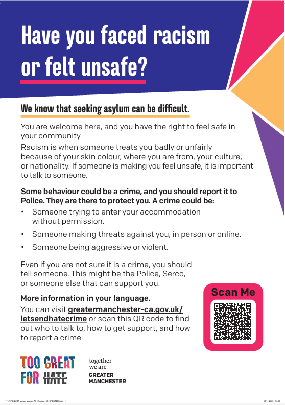 Seeking asylum can be especially challenging during periods of heightened tension and anti-migrant hostility. This poster acknowledges these concerns, provides clear guidance on how to report a crime, and signposts support for anyone who has witnessed or experienced crime.